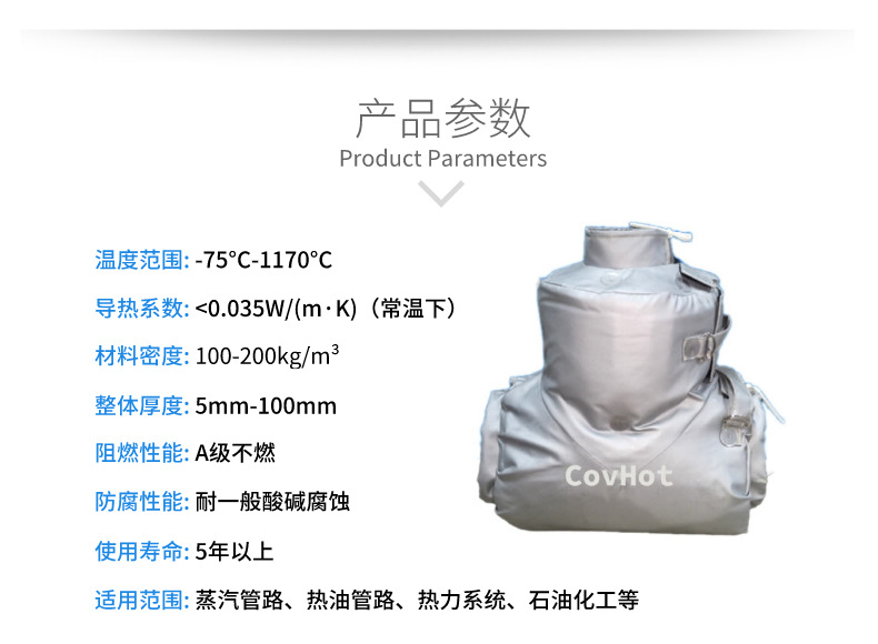 可拆卸截止閥保溫套可以滿足不同領域的柔性保溫應用需求。可以很方便進行拆裝操作,可重復多次使用,以最大化其經濟效益,降低熱損耗。對于一些表面形狀特殊、復雜的設備隔熱(防火),柔性隔熱防火)套也能顯示其獨特的優勢。經測試計算,采用本產品后,通常可節約熱能達90%以上。有些用戶短投資回收期僅為6個月左右。