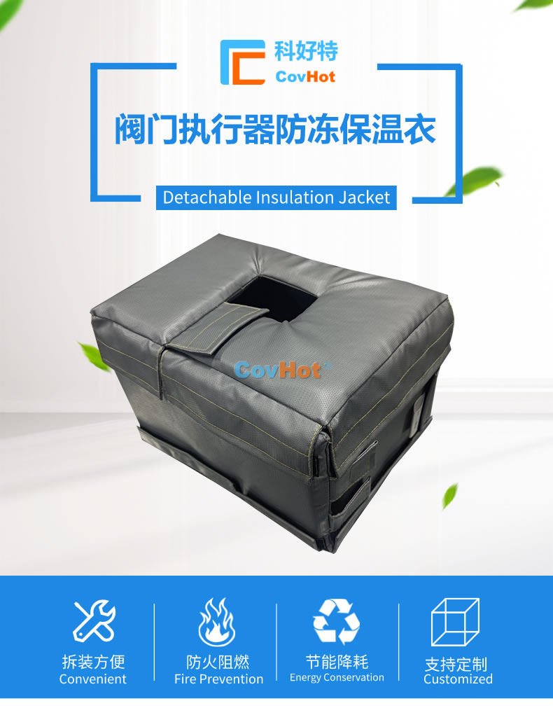 執(zhí)行器防凍保溫套由內(nèi)隔熱包裹層、中間隔熱保溫層、外隔熱防護(hù)層以及電伴熱系統(tǒng)組成,根據(jù)各種型號(hào)的執(zhí)行器工作環(huán)境、外形尺寸等量身定制而成。